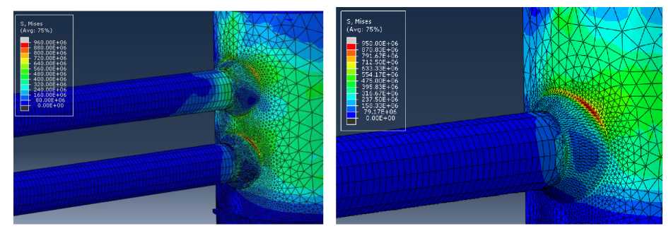 Идентифицированные на основе результатов численного расчета максимальные напряжения на стыке трубопроводов ГЦК и корпуса реактора в реалистичной постановке показаны на рис. 3.