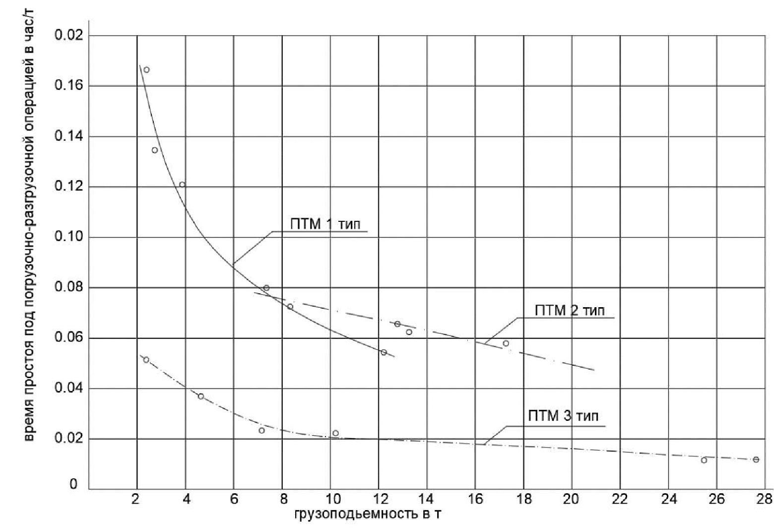 Рис. 2. График зависимости времени простоя погрузочно-транспортных машин под погрузочно-разгрузочными операциями от их грузоподъемности