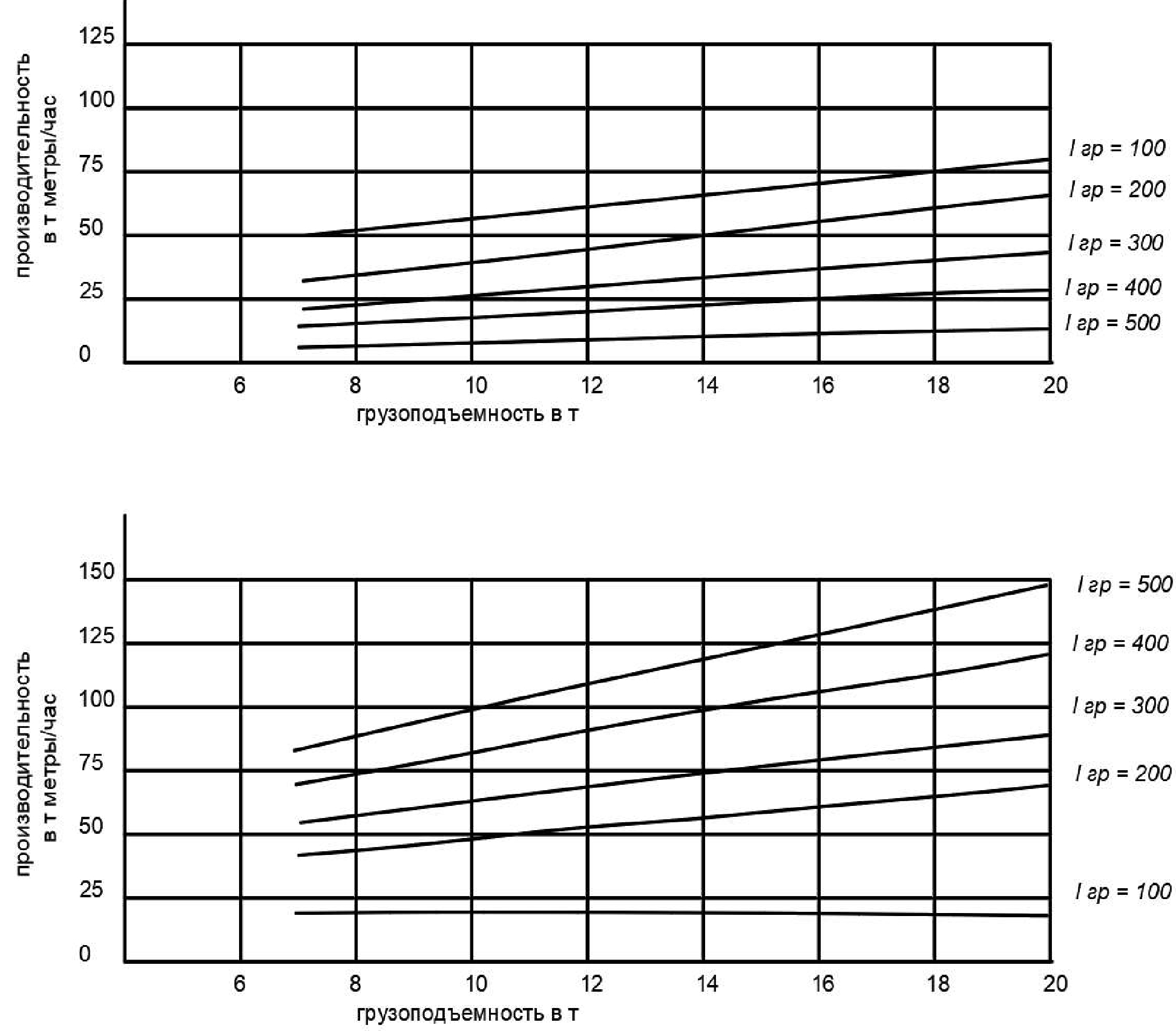 Производительность погрузочно-транспортных машин возрастает по мере увеличения грузоподъемности, до 6-7 т ‒ по закону гиперболы, а далее ‒ по закону прямой линии. Наиболее интенсивный рост производительности отмечается у погрузочно-транспортных машин третьего типа, затем ПТМ второго типа, а самый малый ‒ у одиночных ПТМ первого типа.