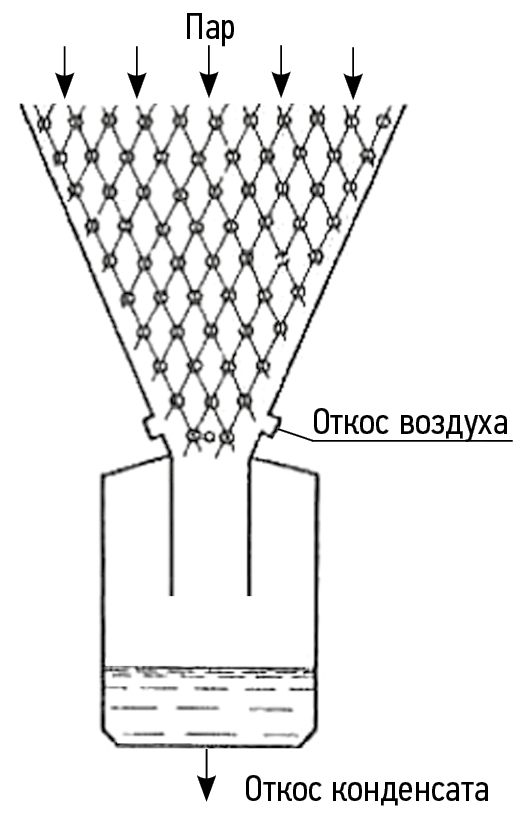 Традиционное техническое решение конструкции конденсатора пара, использующееся в настоящее время в судостроении, ― отработавший пар поступает на цилиндрический трубный пучок, состоящий из прямолинейных теплообменных трубок круглого сечения, внутри которых протекает охлаждающая вода. Пар двигается от периферии к центру трубного пучка, взаимодействует с охлаждающей средой и конденсируется.