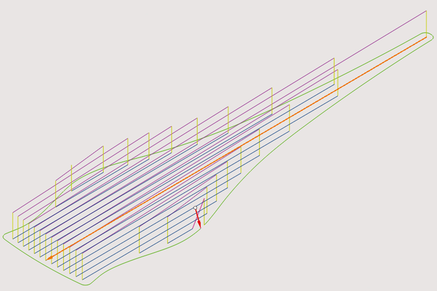 После выбора стратегии и определения всех необходимых параметров был произведен расчет траектории движения инструмента. Импортированная модель была разделена на слои согласно выставленной высоте валика, после чего были рассчитаны траектории заполнения каждого слоя в соответствии с выбранными параметрами и стратегией. Пример заполнения одного слоя представлен на рис. 4.