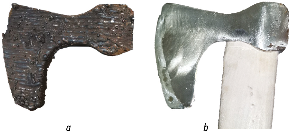 Рис. 5. Реплика средневекового топорища, выращенная по технологии электродугового выращивания с помощью СПРУТКАМ: a ― заготовка до механической обработки; b ― заготовка после механической обработки.