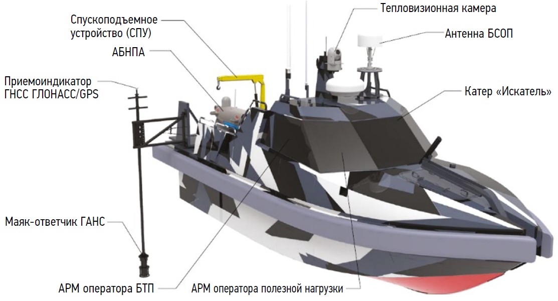Рис. 3. Автономный безэкипажный необитаемый подводный аппарат «Искатель» (Безэкипажный катер «Искатель» на испытаниях в Кронштадте: bmpd — ЖЖ [Электронный ресурс]. URL: https://bmpd.livejournal.com/2725709.html).