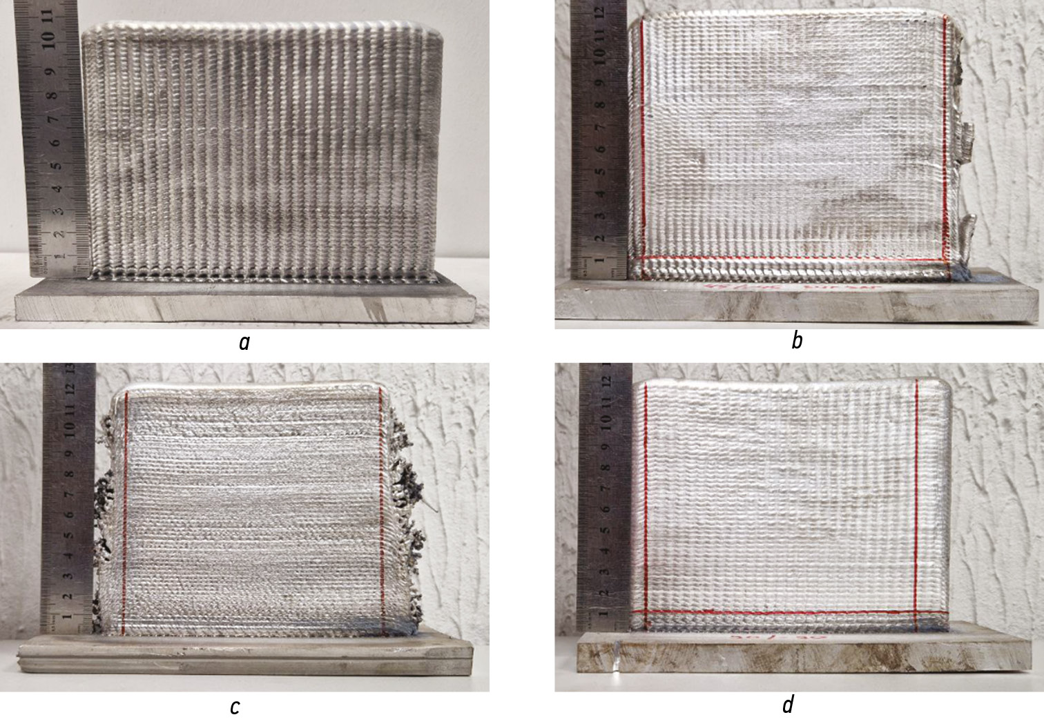 Сварочный ток во всех четырех случаях был взят равным 90 А. При этом первые четыре слоя были выполнены на сварочном токе 120 А. Это необходимо для прогрева подложки до рабочих температур и обеспечения полного сплавления присадочного материала с материалом подложки. Данные слои в дальнейшем были отрезаны и не использовались при механических и металлографических исследованиях.