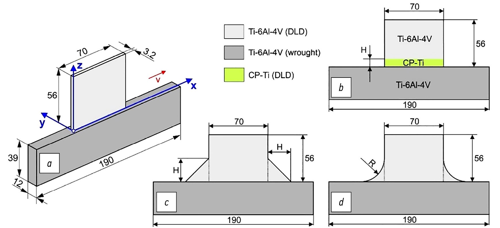 RESULTS: The flat fillets added to the ends of the deposit has little effect on the magnitude of residual stresses and accumulated plastic deformations. Concave fillets significantly reduce plastic deformation, ensuring the manufacturing of defect-free deposits. The most effective approach was to add a less durable but more plastic interlayer between the rigid substrate and the deposit made of a stronger alloy. In this case, the highest level of accumulated plastic deformations is achieved at the ends of the deposit in the soft interlayer region and depends little on the interlayer length. The stronger part of the Ti-6Al-4V deposit has no effective plastic deformation.