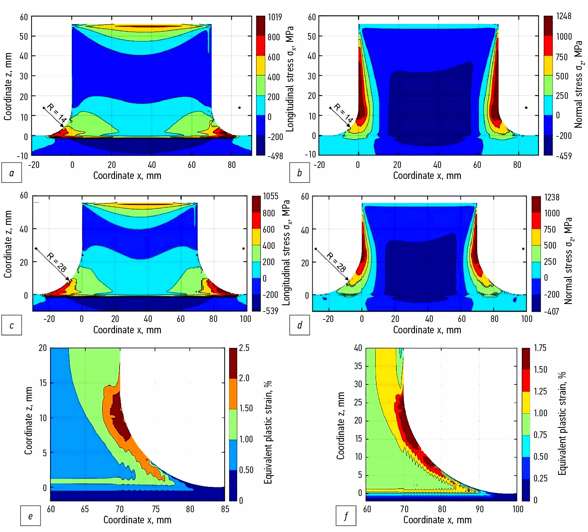 Показанные на рис. 5, а, c поля продольных напряжений не отличаются по характеру распределения от описанных п. 1 и 2. Можно отметить увеличение областей растягивающих напряжений, формирующихся вблизи перехода от галтелей к подложке. Из рис. 5, b, d видно, что области концентрации растягивающих нормальных напряжений и накопленных пластических деформаций смещены от подложки в вертикальном направлении. При радиусе галтели 14 мм смещение составляет примерно 8 мм, а при радиусе 28 мм уже 20 мм. Уровень пластических деформаций существенно ниже, чем в случае плоских галтелей. Вогнутые галтели приводят к снижению пластических деформации по сравнению с наплавкой без галтелей в 2,8 раза при радиусе галтели 14 мм и в 5,83 раз при радиусе галтели 28 мм. Можно с уверенностью утверждать, что при наличии вогнутых галтелей разрушение наплавки не произойдет.