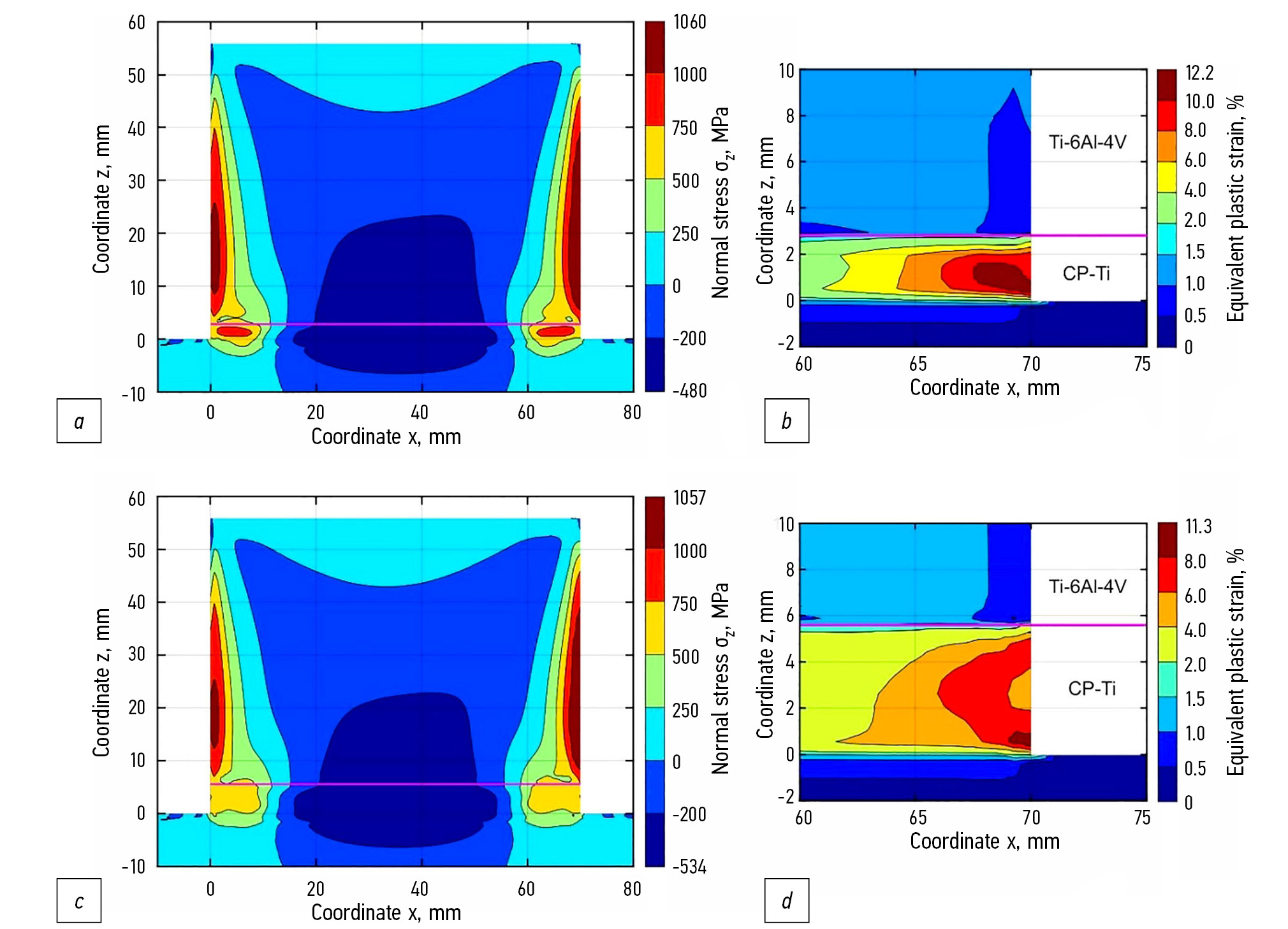 Наличие менее прочной, но более пластичной прослойки приводит к неоднородному деформированию наплавки (рис. 6). Очаги пластического деформирования находятся на торцах наплавки в области мягкой прослойки из технически чистого титана, имеющей более низкое значение предела текучести, чем сплав Ti-6Al-4V. Накопленные пластические деформации здесь достигаю 12,2% и мало изменяются при увеличении вдвое ширины прослойки. Поскольку экспериментально замеренная пластичность чистого титана, полученного ПЛВ, составляет 24,5% [22] можно предположить, что в данных областях не возникнет разрушение. Чем тоньше мягкая прослойка, тем больше величина градиента пластических деформаций и тем выше степень трехосности напряженного состояния. Более прочная часть наплавки из сплава Ti-6Al-4V практически не претерпевает пластического деформирования в обоих рассмотренных случаях. Уровень нормальных напряжений и протяженность областей концентрации нормальных напряжений в этой части наплавки существенно меньше, чем в наплавке только из сплава Ti-6Al-4V (см. п. 1).