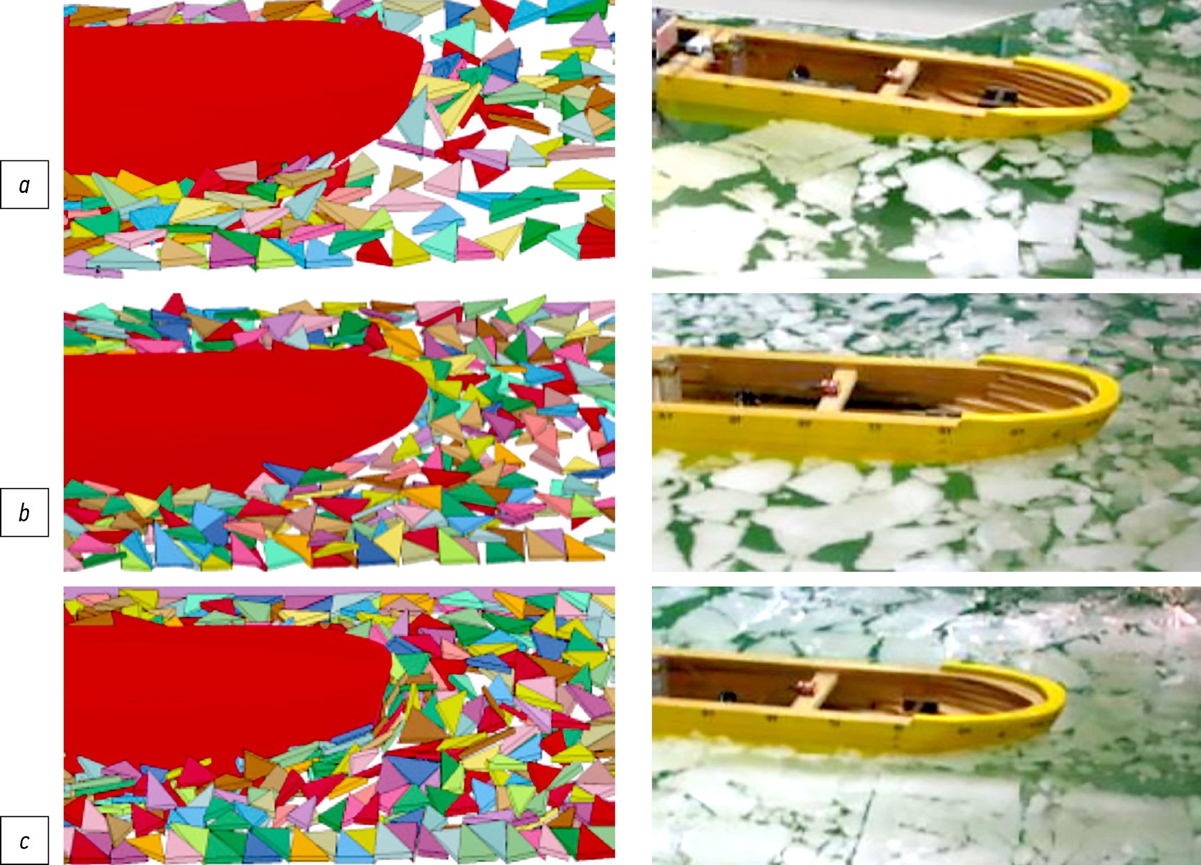 Рис. 4. Моделирование навигации судна в плоском льду с помощью FEM–DEM [26].