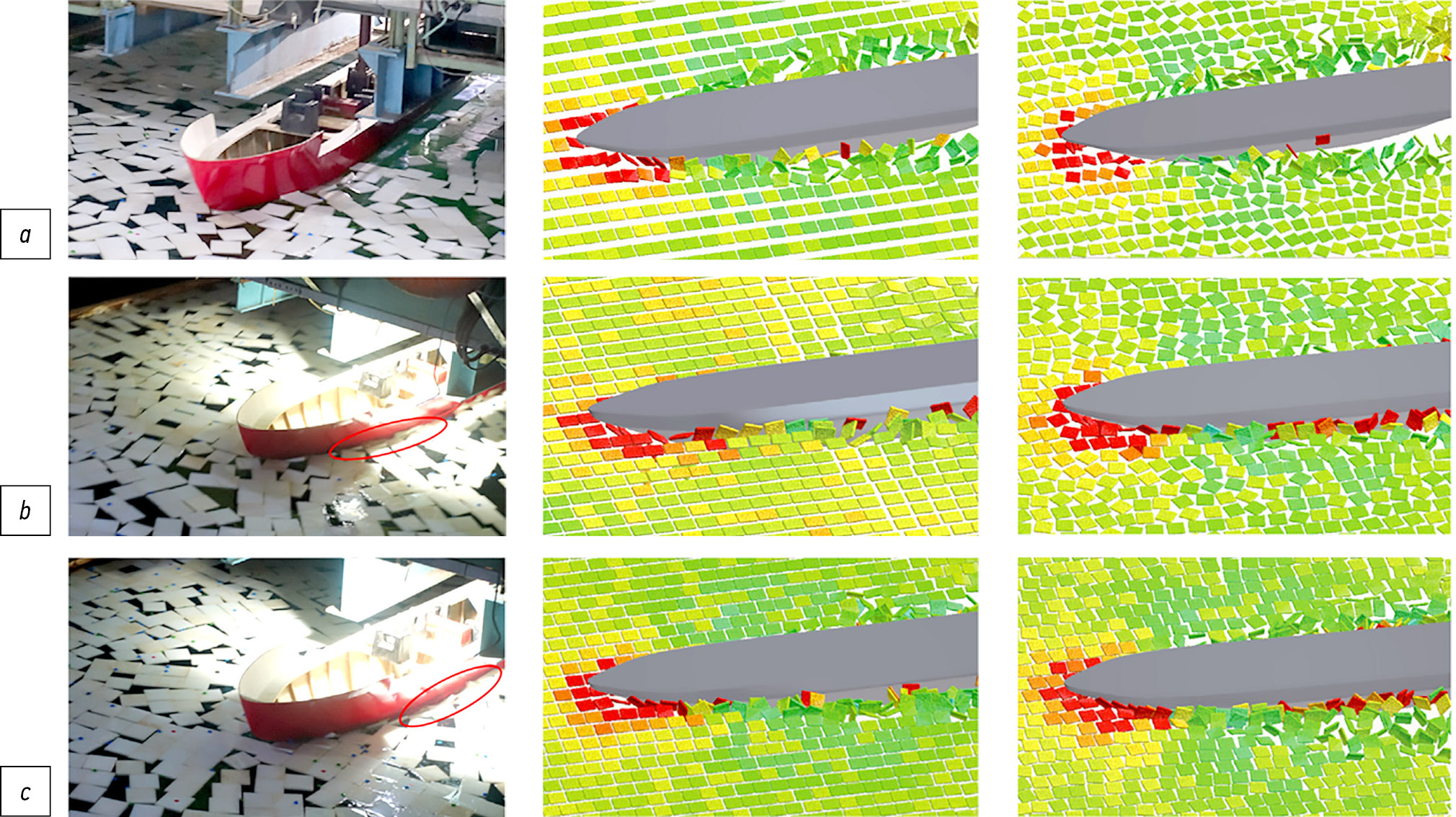 Рис. 5. Численная модель корабля в сравнении с модельным экспериментом при различной сплоченности льда [9]: a — 60%, b — 80%, c — 90%.