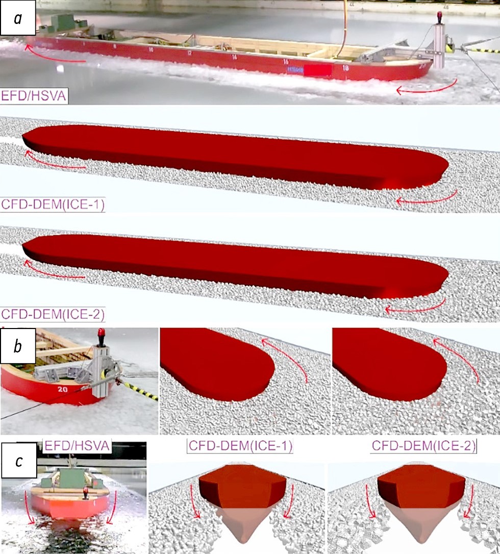 Сопротивление ледоходу в ледовых условиях с применением DEM и CFD методов исследуется в [34]. Изучено сопротивление судна, идущего по полям битого льда в масштабе модели с учетом силы трения битого льда, а также сопротивления вод и гидродинамической силы битого льда. Ошибка между результатами численного моделирования и результатами испытаний составляет менее 5%. Исследовано и подтверждено влияние коэффициента трения судна о лед, толщины льда, формы льда, ширины канала битого льда и концентрации льда на сопротивление судна.