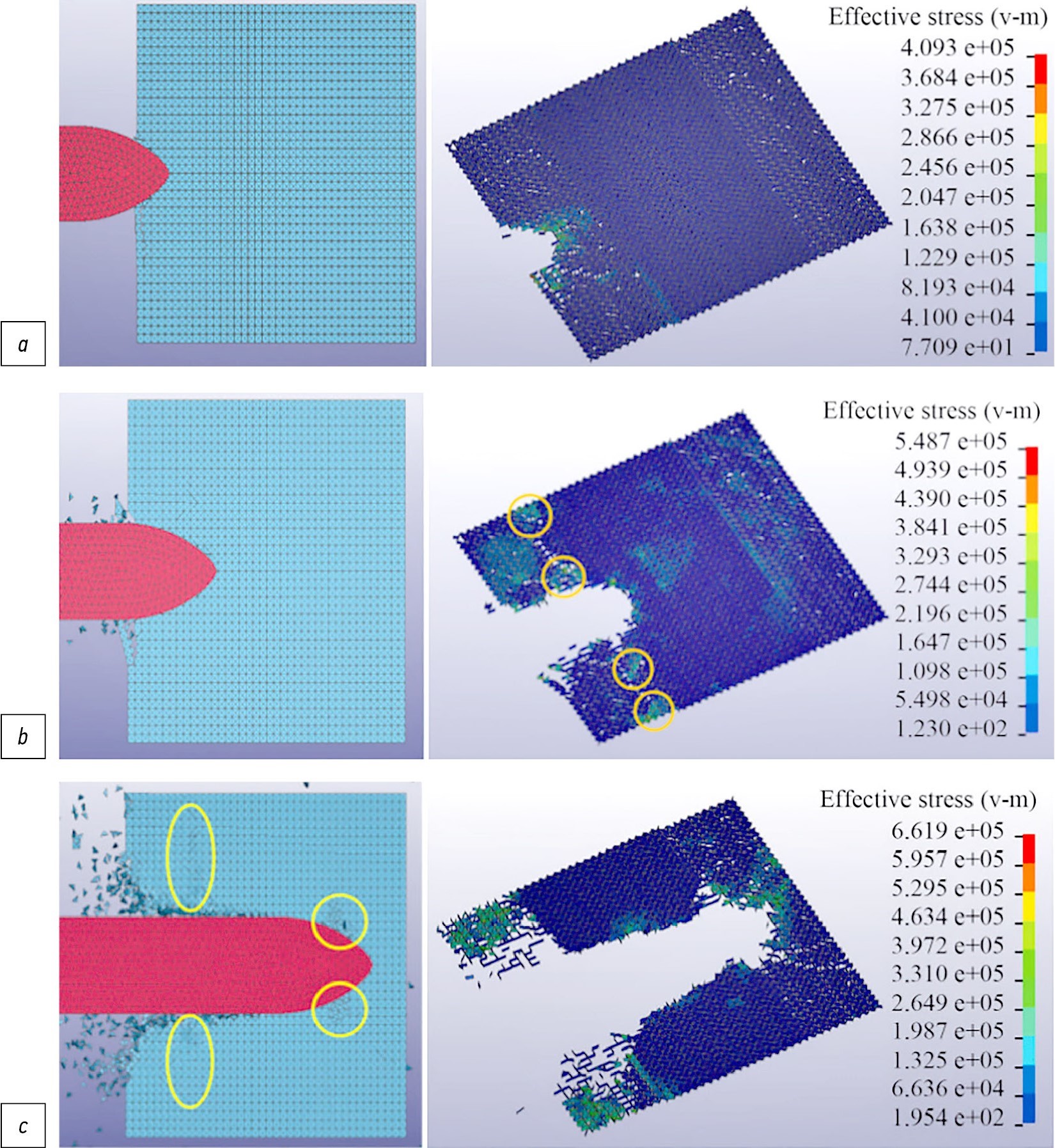 Для повышения точности моделирования взаимодействия судна со льдом в FEM были интегрированы некоторые алгоритмы моделирования жидкостей, такие как метод Эйлера-Лагранжа [15] и Эйлерово-консольный метод [16]. Кроме того, в последние годы адаптивный подход к FEM в сочетании с SPH считается эффективным методом моделирования взаимодействия морских сооружений со льдом [17]. Эта методика позволяет конвертировать конечные элементы в частицы в зависимости от заданных условий. На рис. 1 представлены результаты численного моделирования, на которых видно образование накоплений льда в носовой части судна, а также различия, возникающие в зависимости от формы судна.