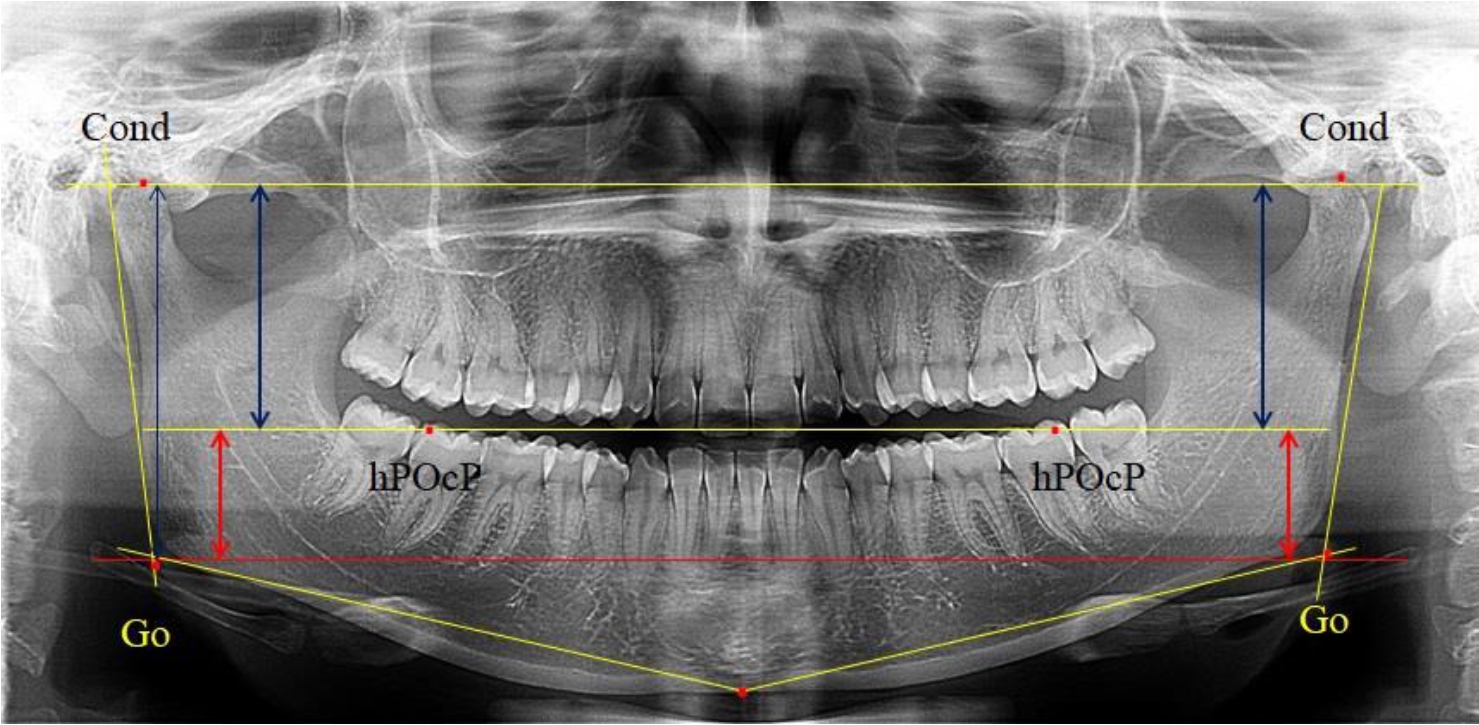 На боковых телерентгенограммах определяли положение верхней точки суставной головки Cond. Касательные линии к ветви и телу нижней челюсти пересекались в точке, которую в клинической практике обозначают как точка угла нижней челюсти или точка гонион Go. Точкой hPOcP обозначали дистальный бугорок нижнего второго моляра вблизи окклюзионного контура коронки, через нее от межрезцовой точки проводили окклюзионную линию, ее продолжали до задней части ветви челюсти. Высоту ветви измеряли как расстояние от угла нижней челюсти до вершины суставной головки Go-Cond. Общую высоту ветви условно делили на 2 части, ее границей служила окклюзионная линия. Верхнюю часть обозначали как окклюзионно-суставная, а нижнюю – как окклюзионно-гониональная.