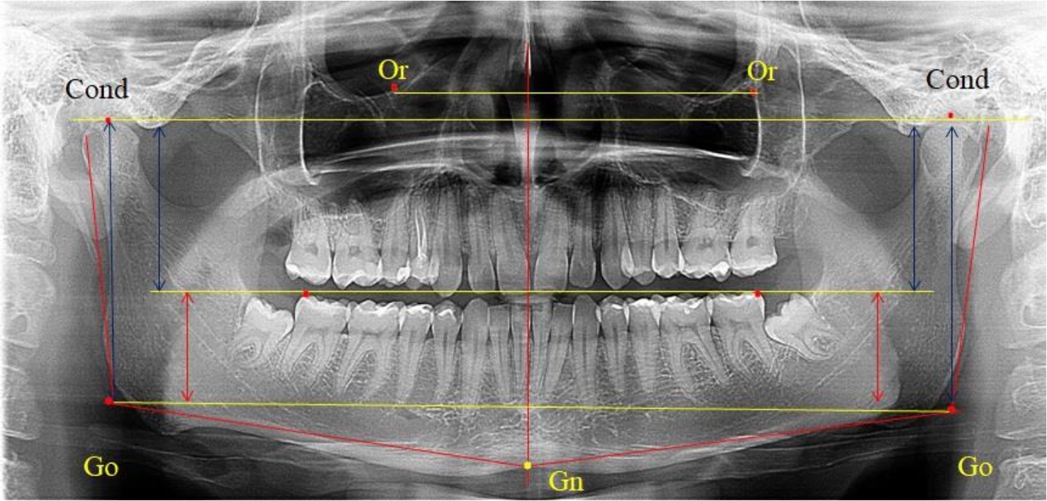 На ортопантомограмме использовали аналогичные суставные точки Cond на каждой стороне, их соединяли между собой суставной линией Cond-Cond.