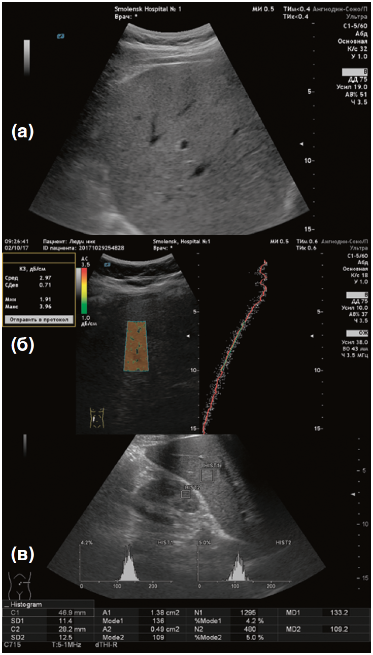 Примечание. (а) — ультразвуковое исследование печени в В-режиме (увеличение органа в размере, эхогенность повышена, звукопроводимость снижена, мелкие и средние сосуды не визуализируются). (б) — ультразвуковое определение гепаторенального индекса (ГРИ 0,84). (в) — ультразвуковая стеатометрия (коэффициент затухания ультразвуковой волны 3,37 дБ/см).