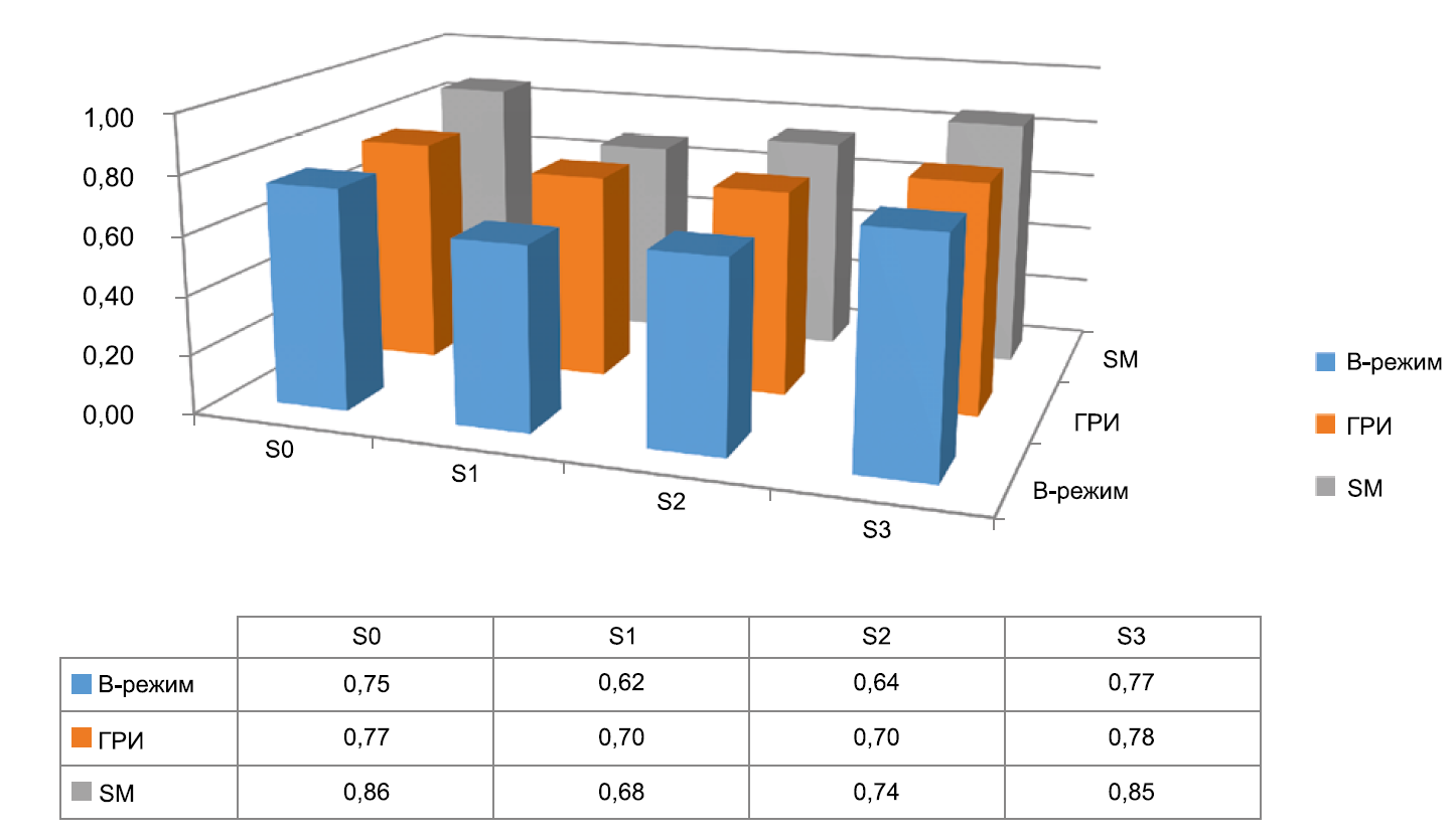 Рис. 3. Диаграмма: корреляция мультипараметрического ультразвукового исследования с гистологическим стадированием стеатоза по биопсии печени