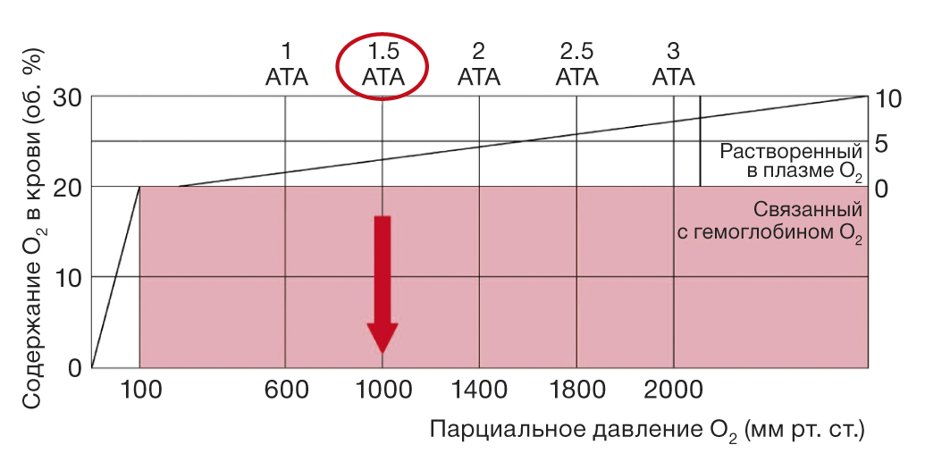 Рис. 4. Изменение содержания кислорода в крови (об. %) под воздействием гипербарической оксигенации (адаптировано из [8]).