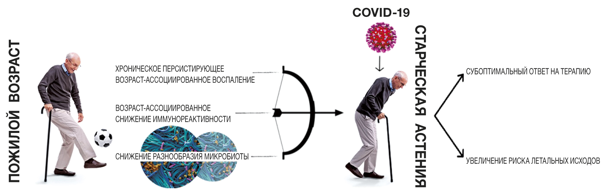 С начала пандемии люди пожилого и старческого возраста составили наибольшую долю населения по результатам госпитализации и смертности из-за COVID-19 не только в нашей стране, но и в Европе, Великобритании, Соединенных Штатах Америки (США) и Канаде [9, 10]. По сравнению с молодыми, они более подвержены неблагоприятным исходам не только при вирусных инфекциях, но и многих сопутствующих возрасту заболеваниях [25]. Установлено, что с годами у пожилых людей происходит постепенное подавление иммунной реактивности из-за снижения количества нативных CD4+CD45RA+Т-лимфоцитов, накопления Т-клеток памяти и изменения функции В-клеток, продуцирующих антитела [72, 73]. Такая трансформация, являющаяся ключевым звеном инфламэйджинга (от англ. inflammageing), получила название «иммуносенесценция» (от англ. immunosenescence). Теория инфламэйджинга рассматривает старение организма и развитие возрастассоциированных заболеваний как следствие хронического персистирующего воспалительного процесса, который развивается на протяжении всей жизни под негативным воздействием факторов инфекционной и неинфекционной природы. Инфламэйджинг обладает рядом свойств, отличающих его от острого воспаления, а именно: хроническое течение, слабая степень выраженности воспалительного процесса, стертость клинических проявлений [7]. Примечательно, что инфламэйджинг ассоциируется с прогрессирующим увеличением провоспалительных цитокинов, включая интерлейкины IL-1b, IL-6, фактор некроза опухоли альфа (TNF-α) [74], что существенно влияет на исход заболевания при заражении COVID-19 и выживаемость пациентов с синдромом старческой астении при тяжелом течении инфекции [74].