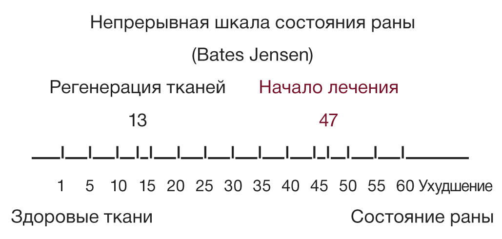 Clinical case description: Patient Yu., 64 years old, was admitted on October 19, 21 for an outpatient treatment of purulent-necrotic wounds of the amputation stump of the right lower limb. А high amputation was performed on September 24, 2021 due to thrombosis of the femoral-tibial bypass, installed on September 08, 2021 (bypassing below the knee joint gap with a Vascutek 7 mm synthetic prosthesis on the right) and the development of critical ischemia of the right lower limb with necrosis of the distal phalanges of the right foot toes. The wound was assessed according to the Bates-Jensen scale (BJ) and examined according to the developed protocol. The wound treatment was carried out according to an individual plan using a conditioned culture medium from mesenchymal stem cells (CM-MSCs), which stimulates angiogenesis and improves remodeling and recovery in the wound area. CM-MSC application made it possible to reduce the healing time and achieve a scarless closure of the tissue defect.