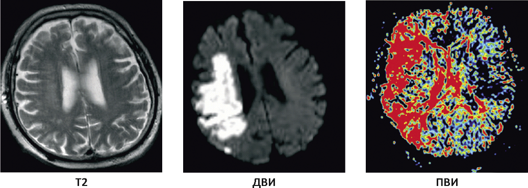 Перфузионная МРТ, как и перфузионная компьютерная томография, применяется для наиболее ранней верификации патологических изменений в веществе головного мозга и анализа степени выраженности ишемии и гипоксии при церебральном поражении: количественной оценки зон гипер- и гипоперфузии, объема мозгового кровотока и других показателей [13], в связи с чем последние годы все чаще перфузионно-взвешенные изображения становятся неотъемлемой частью диагностического протокола у больного с подозрением на церебральную ишемию (рис. 3). Следует отметить, что большая информативность перфузионной МРТ достигается при сочетании с диффузионными исследованиями, МР-ангиографией и MP-спектроскопией [1]. Диффузионная и перфузионная МРТ используются в острейшем и остром периодах ишемического инсульта для выявления изменений нейрональных структур головного мозга. Сопоставление данных, полученных с помощью обоих методов сканирования, имеет прогностическое значение, в частности позволяет дифференцировать обратимые и необратимые ишемические повреждения нейрональных структур [20], что важно для ведения больных с инсультом [12].