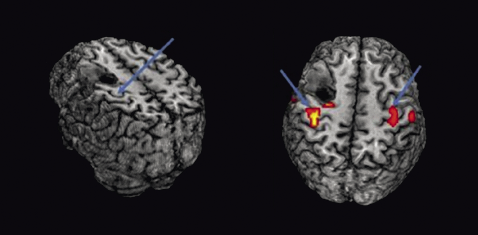 Рис. 4. Функциональная МРТ головного мозга. А: стрелкой указано расположение моторной коры в прецентральной извилине; Б: карта функциональной МРТ-активности в прецентральной извилине при движении рукой