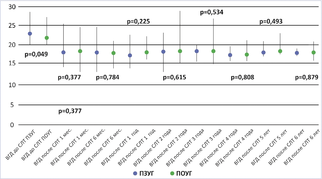 Наиболее противоречивыми следует считать данные литературы о влиянии исходного ВГД и количества местных гипотензивных препаратов для его снижения на результаты СЛТ в отдаленном периоде. Большинство авторов считают, что чем выше исходное ВГД, тем более выражен гипотензивный эффект СЛТ [8; 10; 16–19]. Предполагается, что это может быть связано с более высоким градиентом давления, который в конечном итоге способствует более эффективному трабекулярному оттоку после СЛТ [18]. Точно так же этот эффект выше при исходно большем количестве препаратов, которые больные вынуждены закапывать перед СЛТ для снижения ВГД [19].
