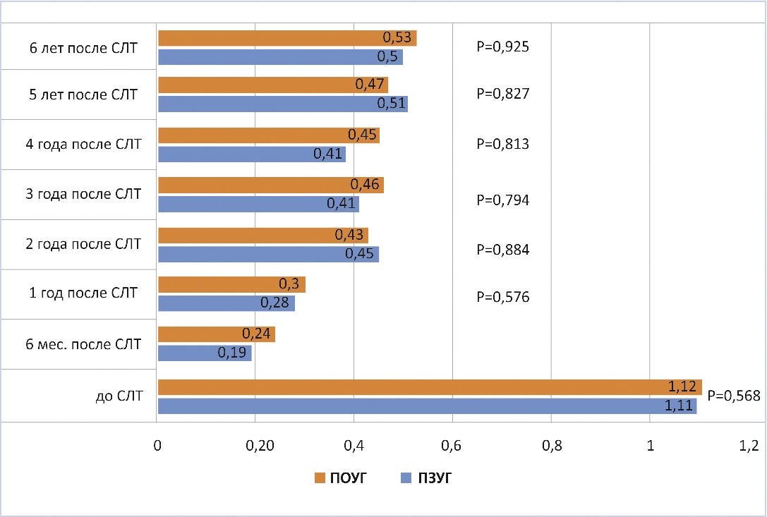 Группы больных с ПОУГ и ПЗУГ были однородны по возрасту (p=0,750), полу (p=0,492), количеству капель до СЛТ (p=0,113), толщине СНВС (p=0,630) и MD (p=0,092), размерам хрусталика (р=0,252) и степени пигментации УПК (p=0,489). При ПОУГ передне-задняя ось (ПЗО) составила 24,08±1,49, размер передней камеры – 3,33±0,36, угол передней камеры в верхнем сегменте – 28,7±5,19. При ПЗУГ отличия наблюдались в ПЗО – 22,39 (p=0,000), размерах передней камеры глаза при ПЗУГ – 2,76±0,44 (p=0,001), сферическом эквиваленте – 1,54±1,66 при ПЗУГ(р=0,000), размерах УПК в верхнем секторе – 13,76±4,940 при ПЗУГ (р=0,003) и параметрах СЛТ.