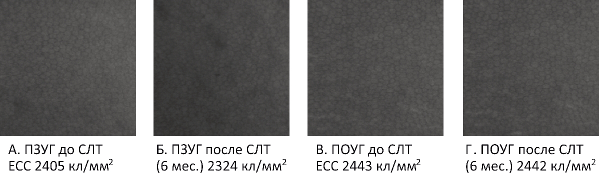 Результаты конфокальной микроскопии показали более значительную потерю плотности эндотелиальных клеток (ЕCC) при ПЗУГ по сравнению с ПОУГ. Примечательно, что, в отличие от ПОУГ, при которой все показатели роговичного эндотелия возвращались к исходным спустя месяц после СЛТ, при ПЗУГ они достоверно отличались от исходных даже спустя полгода после операции. На рис. 3 заметно, что при одинаковых характеристиках эндотелия до СЛТ при обеих формах глаукомы роговичный эндотелий при ПЗУГ, в отличие от ПОУГ, остается измененным спустя полгода после операции: ECC снижена (плотность клеток роговичного эндотелия до СЛТ при ПОУГ 2473±177 и 2436±171 (р=0,180) при ПЗУГ, через 6 месяцев при ПОУГ 2467±154 (р=0,342) и 2396±170 (р=0,002) при ПЗУГ), остаются темные «пустоты», свидетельствующие о сохранении воспалительной реакции со стороны роговичного эндотелия.