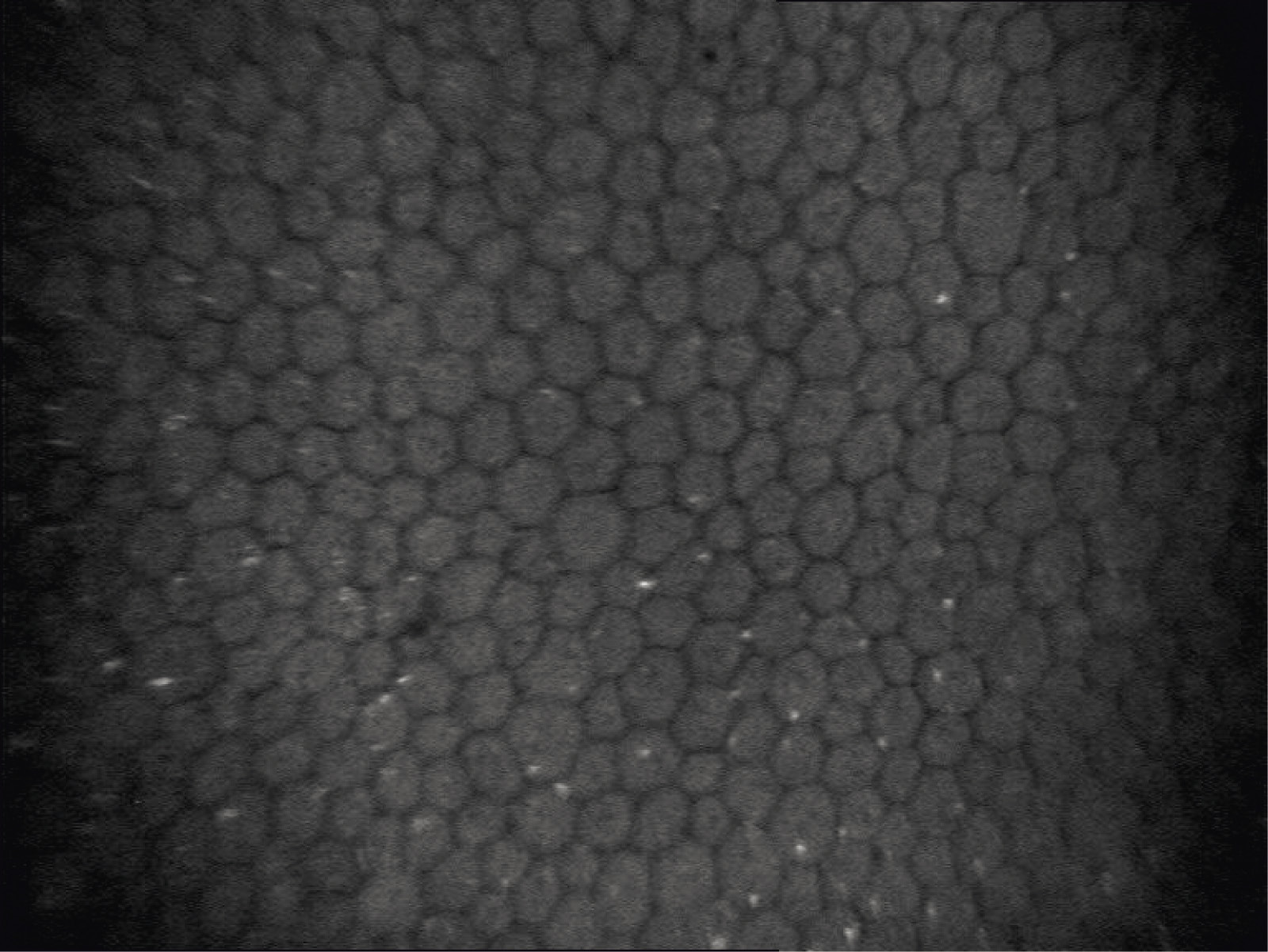 Кроме того, проводили бесконтактную конфокальную микроскопию с помощью щелевого сканирующего конфокального томографа Confoscan 4 (Nidek, Япония). Размер исследуемой области 460×690 мкм, латеральное разрешение 0,8–2,0 мкм/пиксель, размер изображения 768×576. Объектив (×20) размещали на расстоянии 12 мм от роговицы пациента. Микроскоп был выровнен и сосредоточен на центре роговицы.