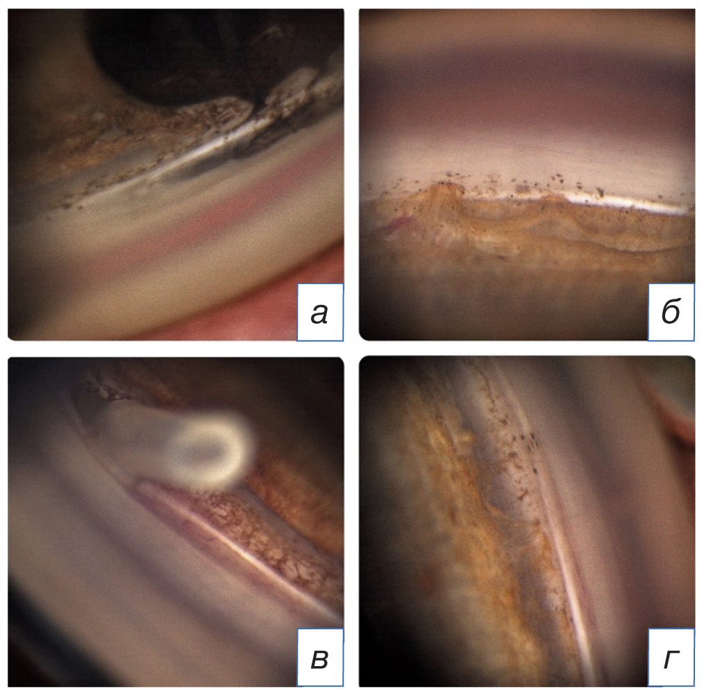 Fig. 1. Gonioscopy: а — sinus trabeculectomy; б, г — goniodysgenesis; в — Ahmed valve tube.
