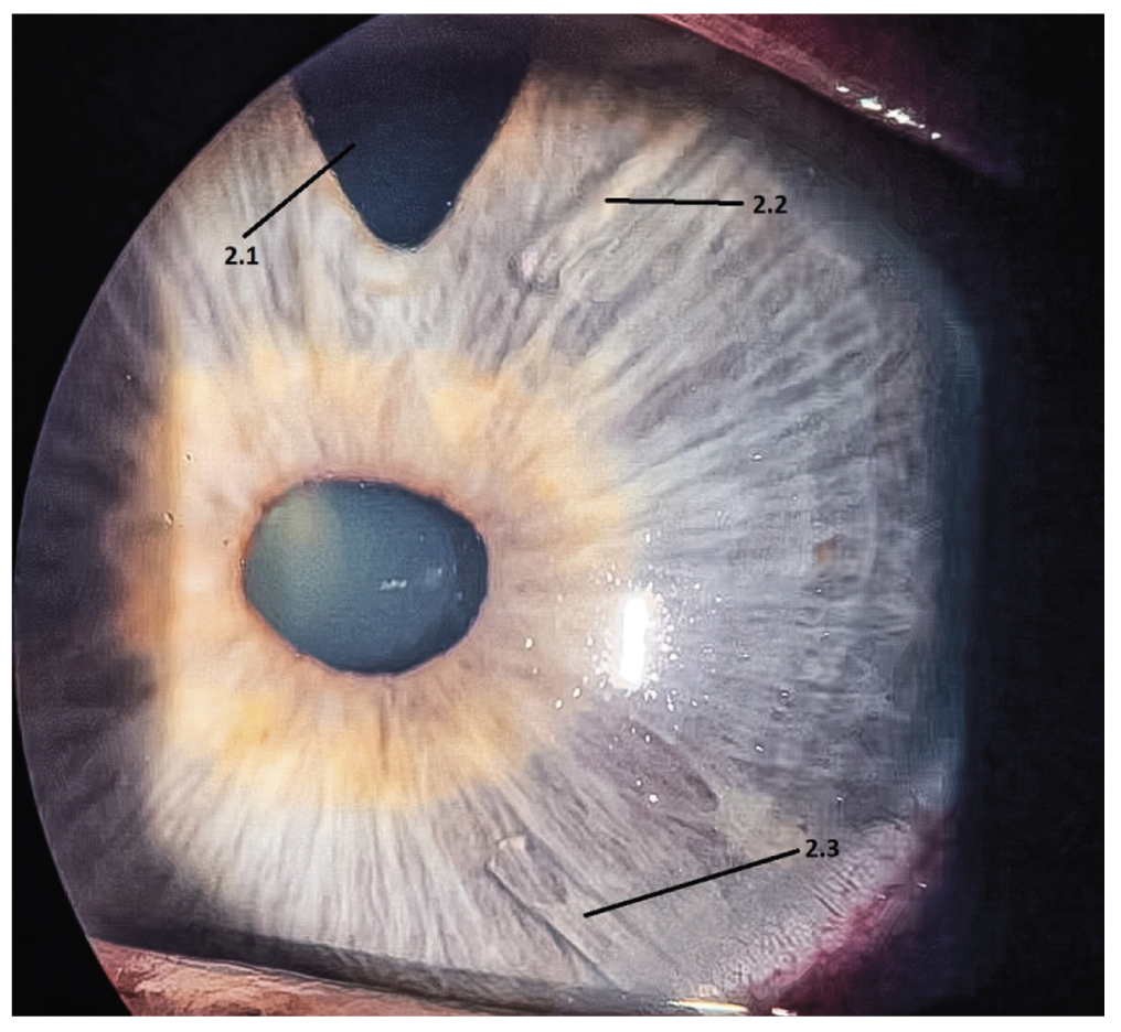 Рис. 2. Фотография переднего отрезка глаза OS после имплантации второго дренажа: 2.1 — зона синустрабекулэктомии; 2.2 — первый клапан; 2.3 — второй клапан.