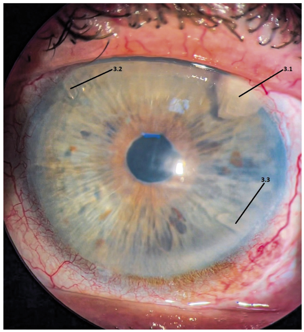 Рис. 3. Фотография переднего отрезка глаза OS: после имплантации второго дренажа: 3.1 — дренаж в зоне синустрабекулэктомии; 3.2 — первый клапан; 3.3 — второй клапан.
