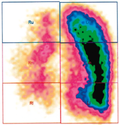 Рис. 1. Перфузионная сцинтиграфия легких: дефицит перфузии в правом легком (вид спереди)