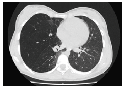 12.04.2018 выполнена торакоскопическая резекция средней доли правого легкого. После ее удаления верхняя и нижняя доли были расправлены. В послеоперационном периоде состояние больной оставалось стабильным. На 11-е сут после операции сохранялся сброс воздуха из правой плевральной полости. Дренажи были удалены на 14-е сут после операции. В настоящее время состояние больной удовлетворительное, жалоб не предъявляет.