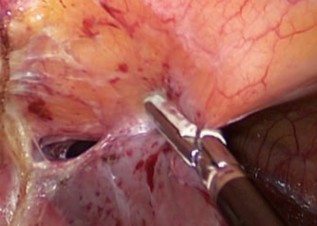 Рис. 3. Этап разделение спаек между передней брюшной стенкой и печенью с помощью ультразвукового скальпеля «Harmonic» (Ethicon).