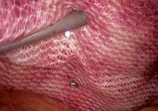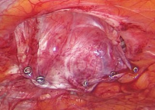 Рис. 7. Окончательная фиксация сетчатого имплантата к передней брюшной стенки с помощью эндогерниостеплера.