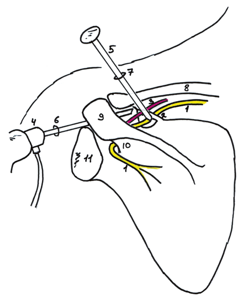 Рис. 1. Схема расположения артроскопа и инструмента при эндоскопической декомпрессии надлопаточного нерва в области вырезки лопатки: 1 — надлопаточный нерв; 2 — поперечная связка лопатки; 3 — надлопаточная артерия; 4 — артроскоп; 5 — обтуратор; 6 — латеральный порт; 7 — порт Невайзера; 8 — ключица; 9 — акромиальный отросток лопатки; 10 — ость акромиального отростка лопатки; 11 — суставной отросток лопатки.