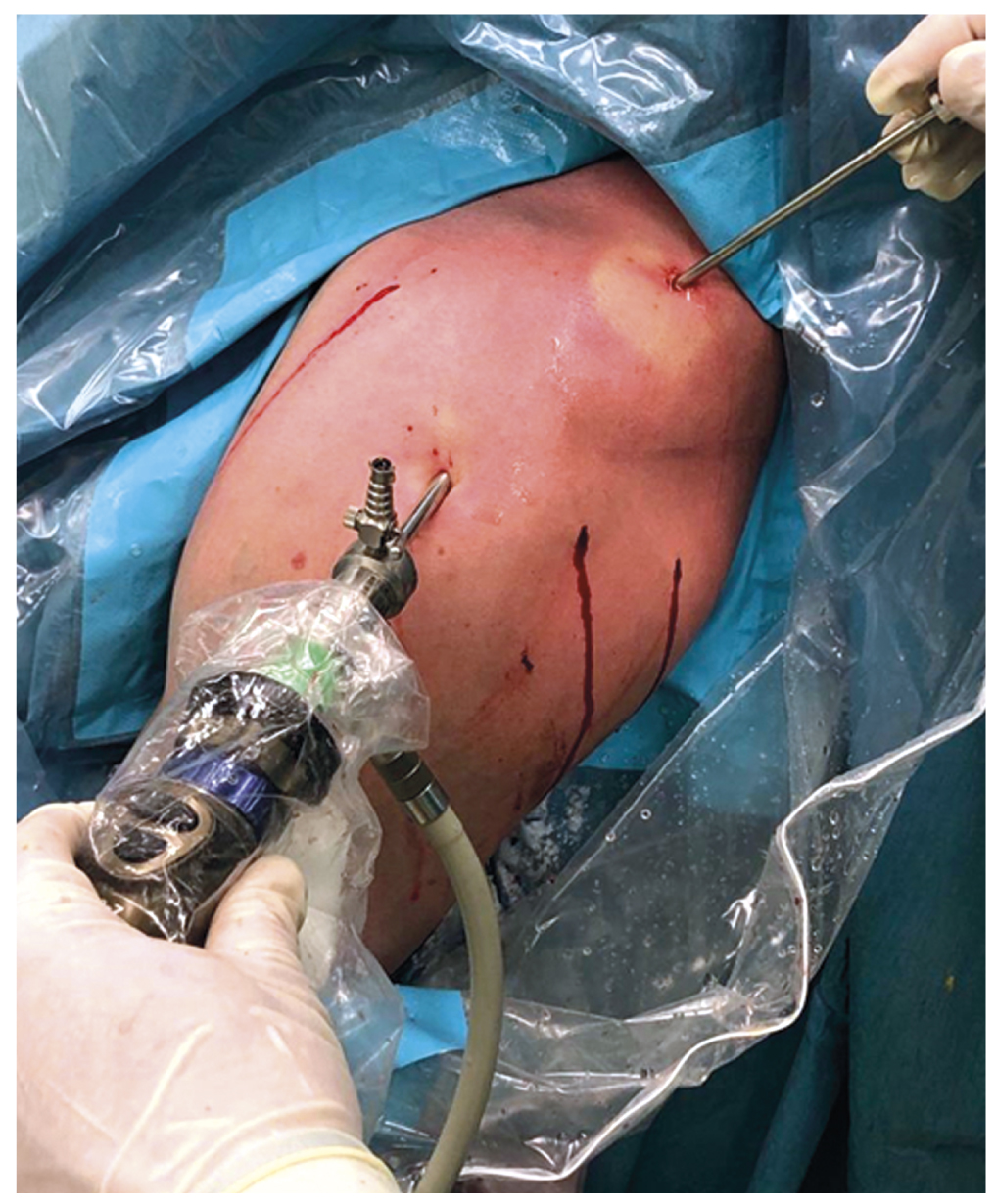 Во время операции мягкие ткани и подкожно-жировая клетчатка умеренно инфильтрировались физиологическим раствором, который являлся средой для выполнения эндоскопического вмешательства.