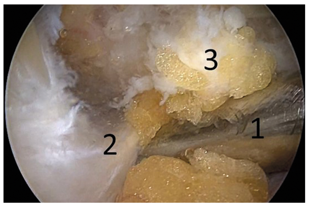Рис. 4. Эндоскопическая картина после рассечения поперечной связки: 1 — надлопаточный нерв; 2 — поперечная связка лопатки.