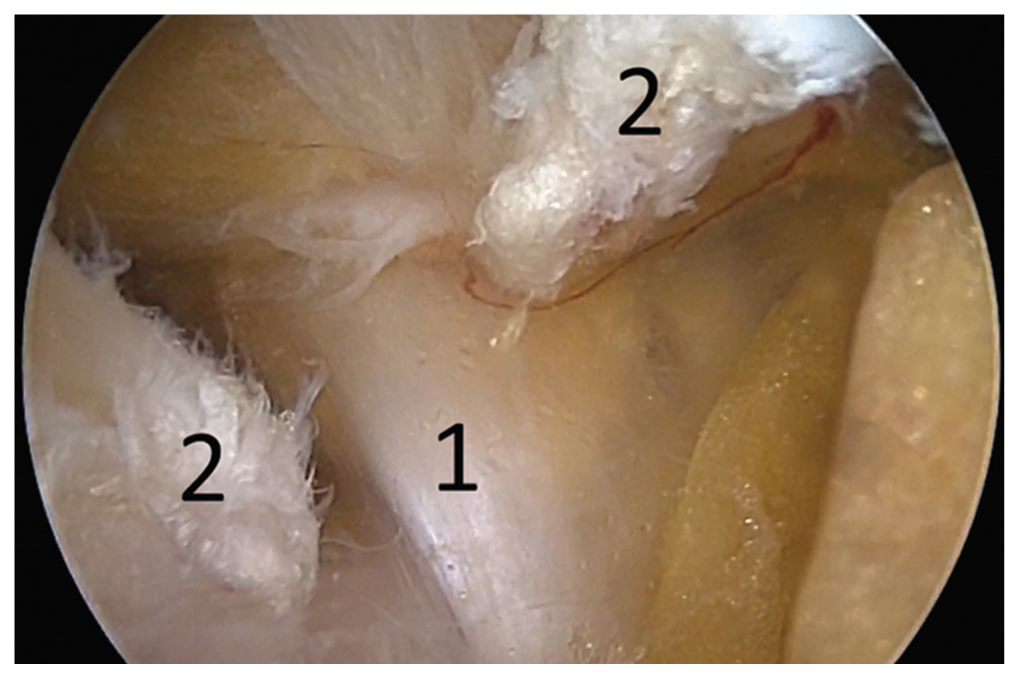 Fig. 4. Endoscopic view after cutting of transverse ligament: 1 — suprascapular nerve; 2 — transverse ligament.