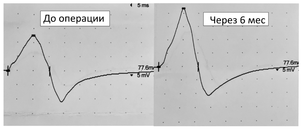 Рис. 5. Динамика увеличения M-ответа по данным стимуляционной электронейромиографии надлопаточного нерва через 6 мес после операции.