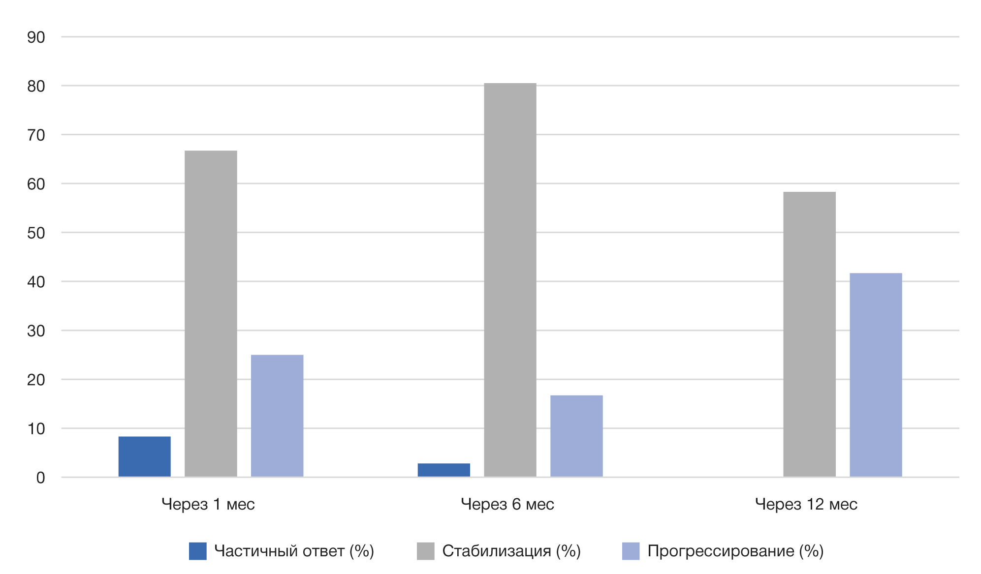 Через 6 мес у 1 (2,8%) больного получен частичный ответ, у 29 (80,5%) диагностирована стабилизация, у 6 (16,7%) — прогрессирование.