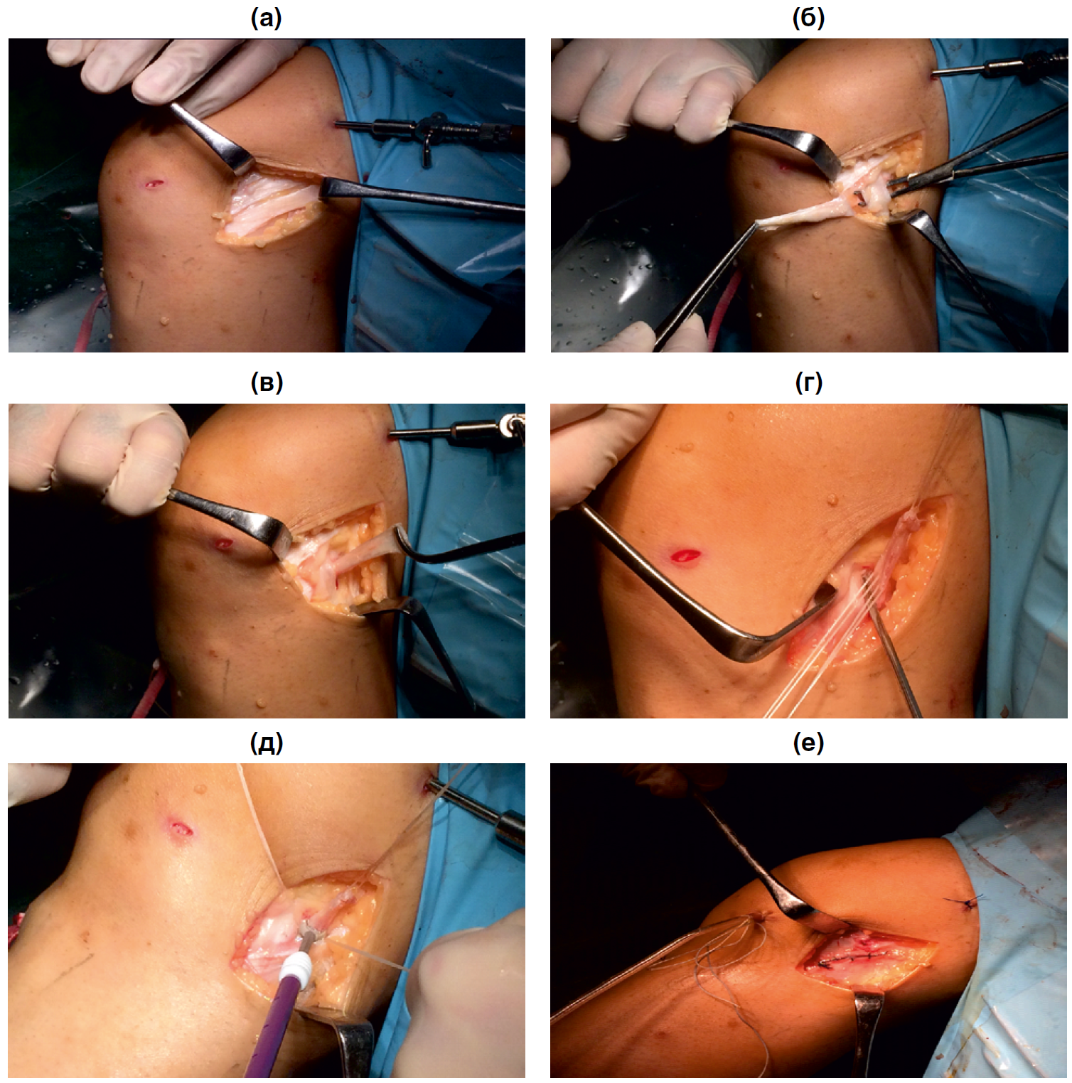 Примечание. (а) — выкраивание лоскута из средне-нижней порции илиотибиального тракта, (б) — выделение наружной коллатеральной связки перед проведением высеченного трансплантата, (в)— проведение трансплантата под наружной коллатеральной связкой, (г) — формирование канала в наружном надмыщелке бедренной кости), (д) — фиксация уложенного в канал трансплантата с помощью биодеградируемого фиксатора в области наружного надмыщелка бедренной кости, (е) — окончательный вид операционного поля.