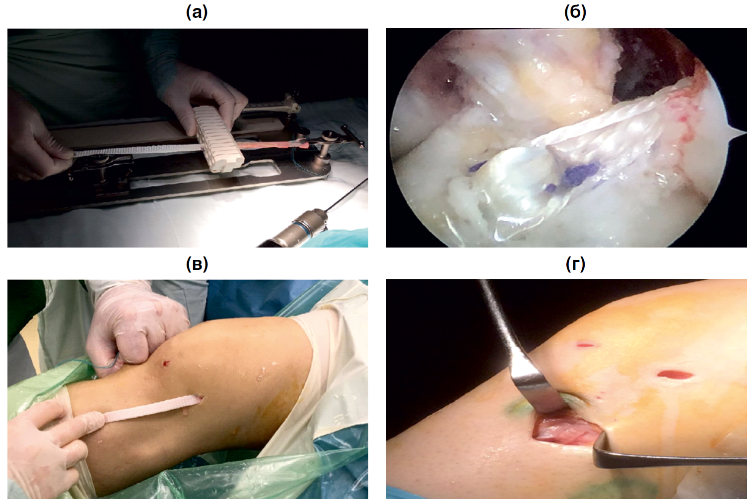 Примечание. (а) — вид сформированного трансплантата передней крестообразной связки из хамстринг-сухожилий со вшитым в него полиэстеровым аугментом, (б) —артроскопический контроль проведения трансплантата в полости сустава, (в)— выведенный изнутри наружу свободный конец трансплантата, состоящий только из синтетического усилителя, для выполнения пластики антеролатеральной связки, (г) — окончательный вид операционного поля после фиксации антеролатеральной связки в точке нативного расположения.