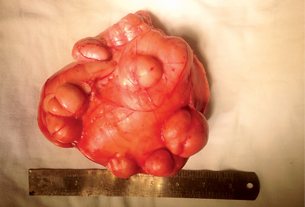 В нашем клиническом случае гигантская липома забрюшинного пространства у ребенка протекала бессимптомно и была диагностирована при физикальном осмотре. В зависимости от объема липомы и расположения близлежащих органов симптоматика может быть разнообразной и включать запоры, боли в спине, пояснице с иррадиацией в ноги по типу ишиалгии и др. [7]. Масса резецированной липомы забрюшинного пространства, по данным литературы, варьирует у взрослых от 145 г до 19,5 кг, у детей — от 140 г до 2 кг [5, 6].