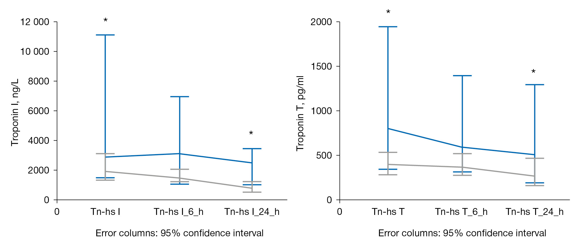 The TnI-hs levels were determined by the immunochemiluminescent method with the PATHFAST analyzer (Japan) using the PATHFAST hs-cTnI test systems (Japan). TnT-hs levels were measured by electrochemiluminescence on Cobas e411 Automated Immunochemical Analyzer (Roche Diagnostics, Switzerland) with a set of reagents troponin T hs-STAT Elecsys (Cobas e).