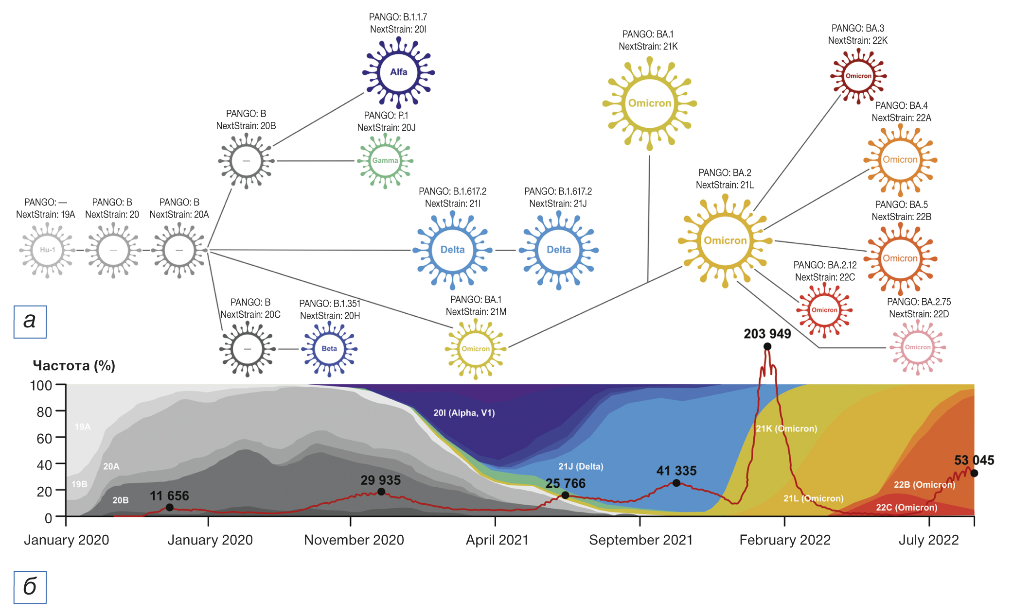 By the beginning of 2022, B.1.617.2 delta, the most virulent and lethal variant of SARS-CoV-2, prevailing worldwide throughout 2021, was almost completely replaced by the new omicron variant BA.1.1.529 (clade 21K) (Fig. 1). Then, by mid-2022, BA.1 was replaced by BA.2 (clade 21L) and then by BA.4/5 (clades 22A and 22B), which subsequently emerged in the Republic of South Africa (South Africa) and spread to other countries concurrently with variant BA.2.12.1 (clade 22C) originating in the USA. As of late August and early September 2022, omicron BA.5 (clade 22B) is the most common strain worldwide [1, 8] (Fig. 1). BA.5, along with strains BA.2.12.1 and BA.4 and some other derivatives of variant BA.2, caused wave 6 of COVID-19 in Russia, which, as of September 21, 2022, causes an official increase of more than 50,000 cases per day.