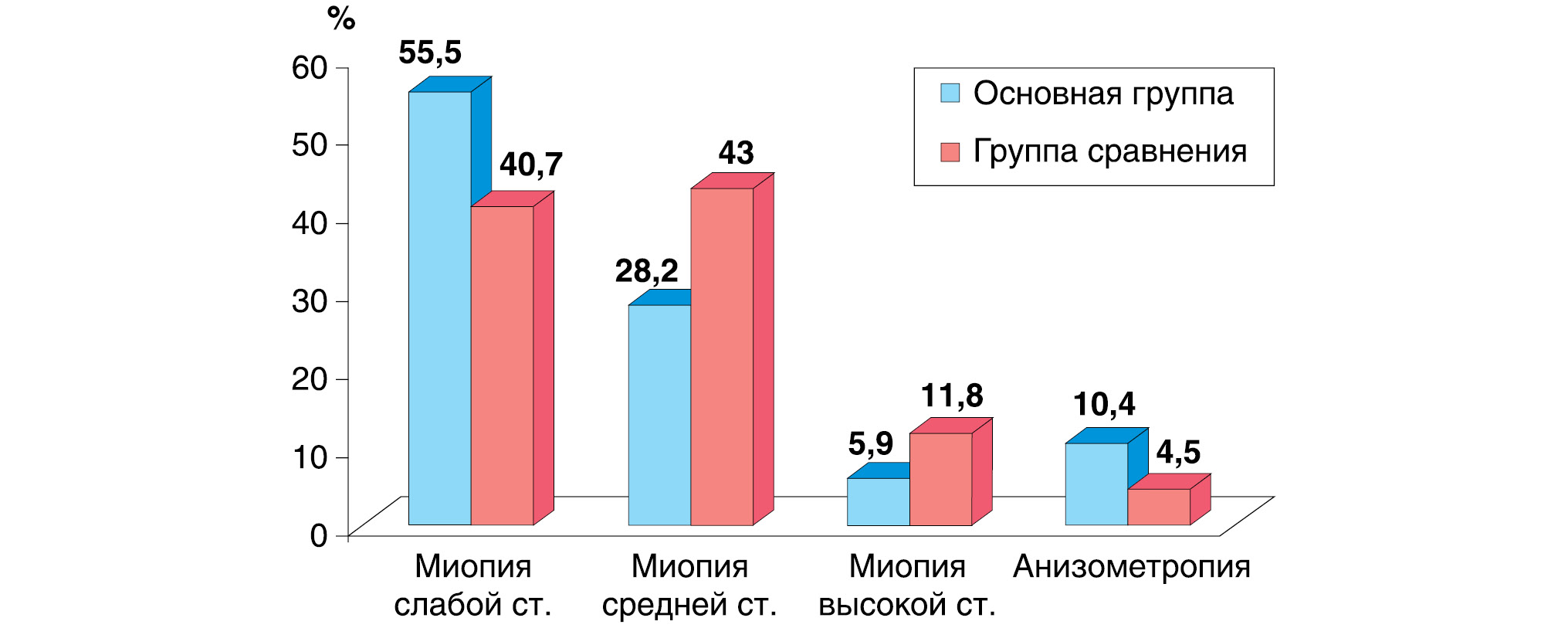 Как видно из рисунка, в обеих группах миопия слабой и средней степени составляла в совокупности 83,7%, остальная доля пришлась на миопию высокой степени и группу пациентов с анизометропией.