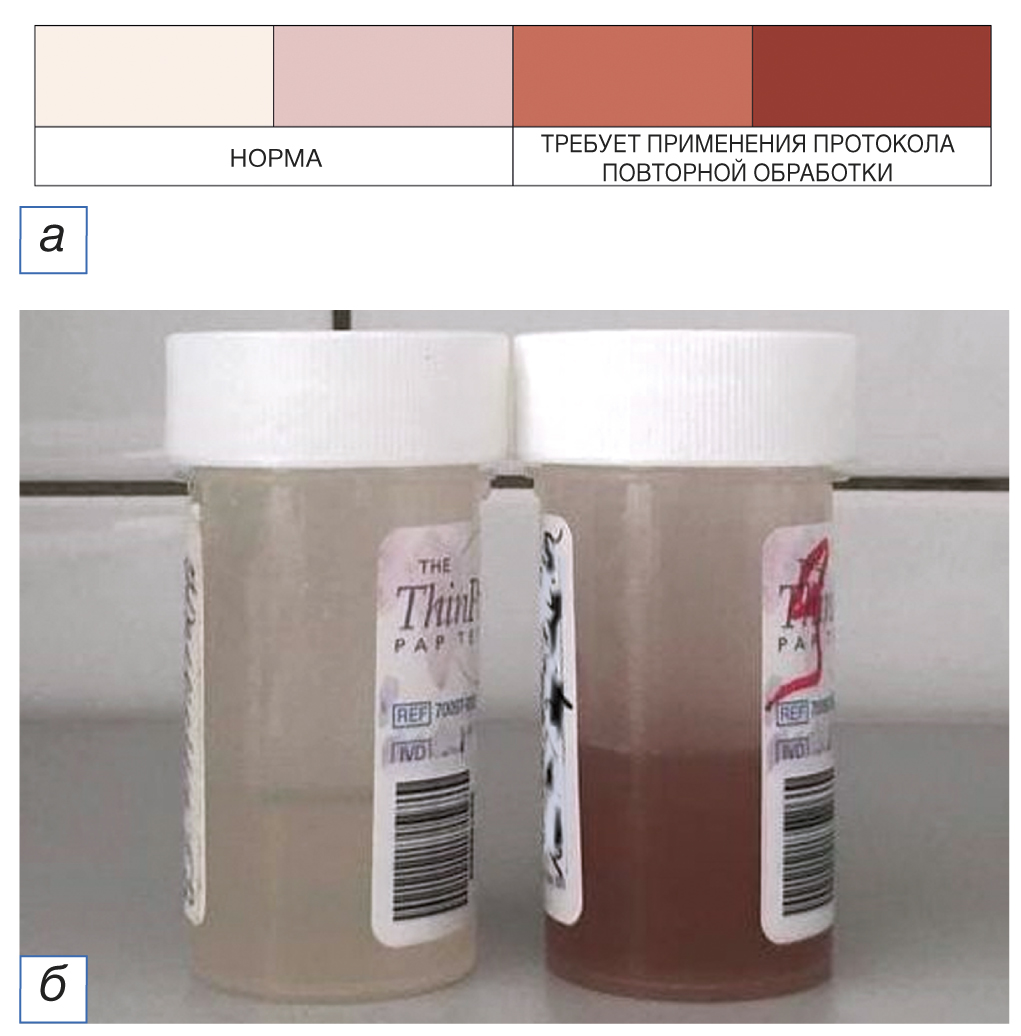 В литературе описано несколько способов приготовления раствора для отмывки образцов. Так, в исследовании M. Rosa и соавт. [9] образцы, признанные неадекватными из-за обилия крови, обрабатывались с применением протокола, предложенного производителем. Раствор Cytolyt смешивали с ледяной уксусной кислотой в пропорции 9/1, затем 30 мл полученного раствора смешивали с образцом, центрифугировали при 1200 g и сливали надосадочную жидкость, затем добавляли PreservCyt, размешивали и обрабатывали образец, как обычно. Образцы, признанные неадекватными вследствие большого количества элементов воспаления, бактерий, лубриканта или слизи, обрабатывали путем добавления 1 мл образца к 20 мл раствора PreservCyt с последующим центрифугированием и загрузкой в процессор.