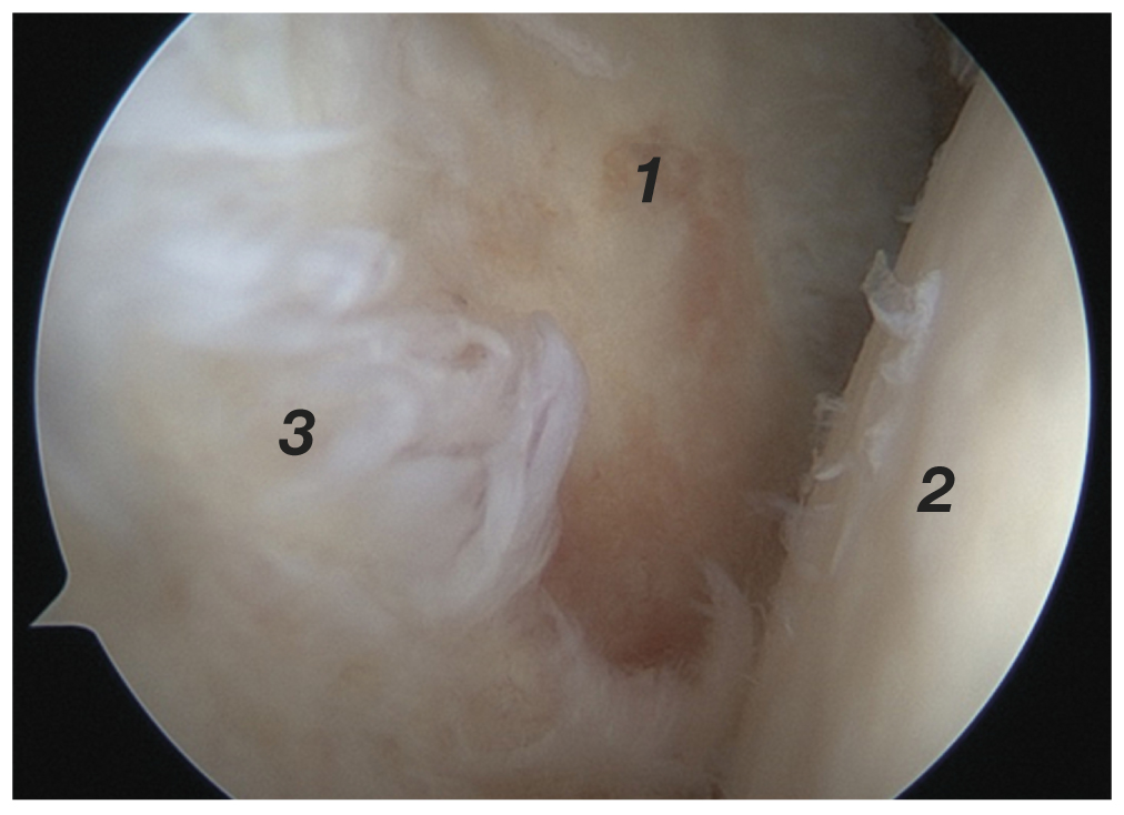 Рис. 1. Эндоскопическая картина плечевого сустава: 1 — суставной отросток лопатки; 2 — головка плечевой кости; 3 — дегенеративно-измененная задняя фиброзно-хрящевая губа. / Fig. 1. Endoscopic view of the shoulder joint: 1 — glenoid; 2 — humeral head; 3 — degenerated posterior labrum.