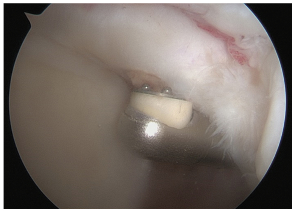 В одном случае выявлен массивный невосстанавливаемый разрыв сухожилия вращательной манжеты плеча, в связи с чем была осуществлена имплантация субакромиального спейсера [14] (рис. 3).